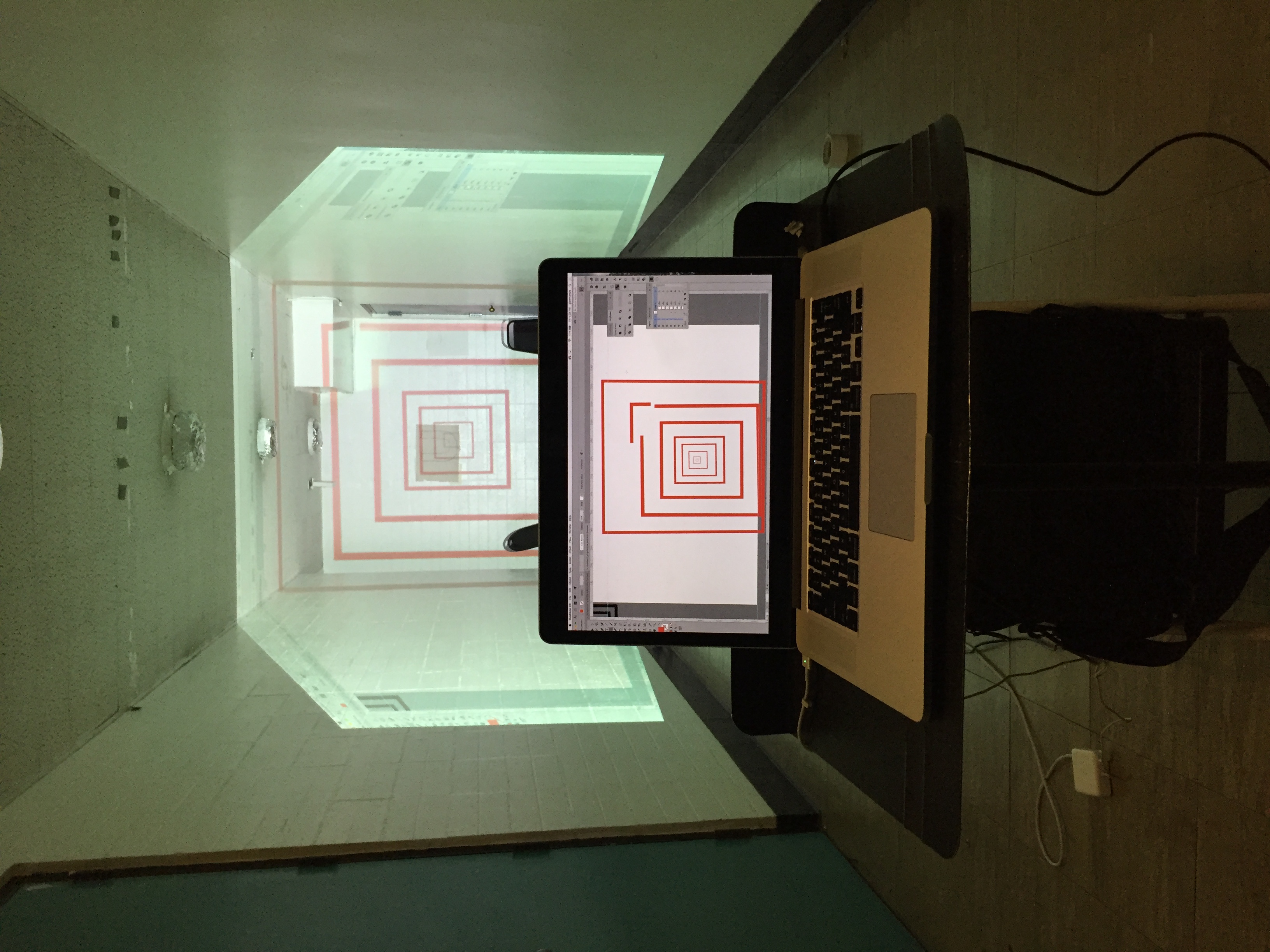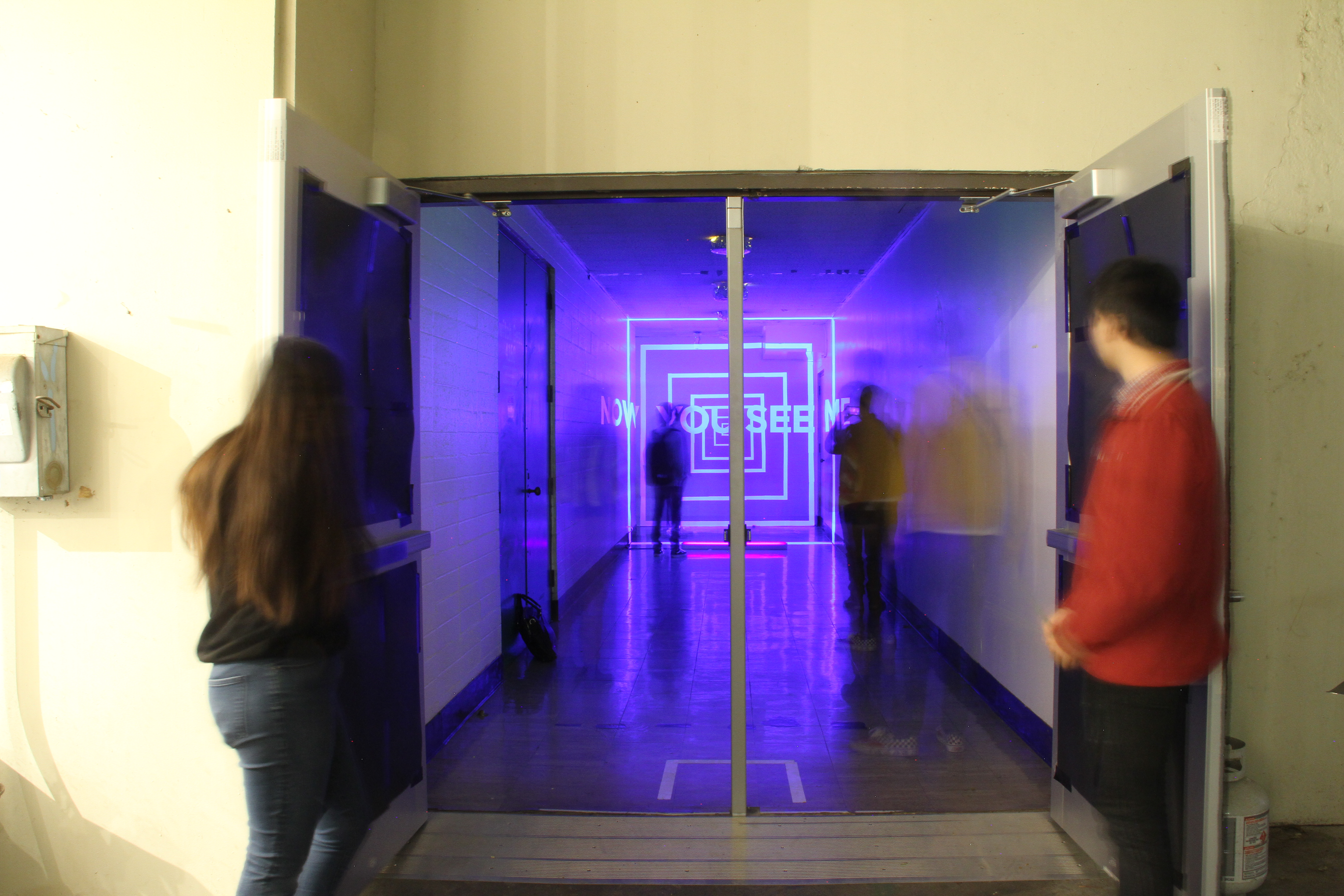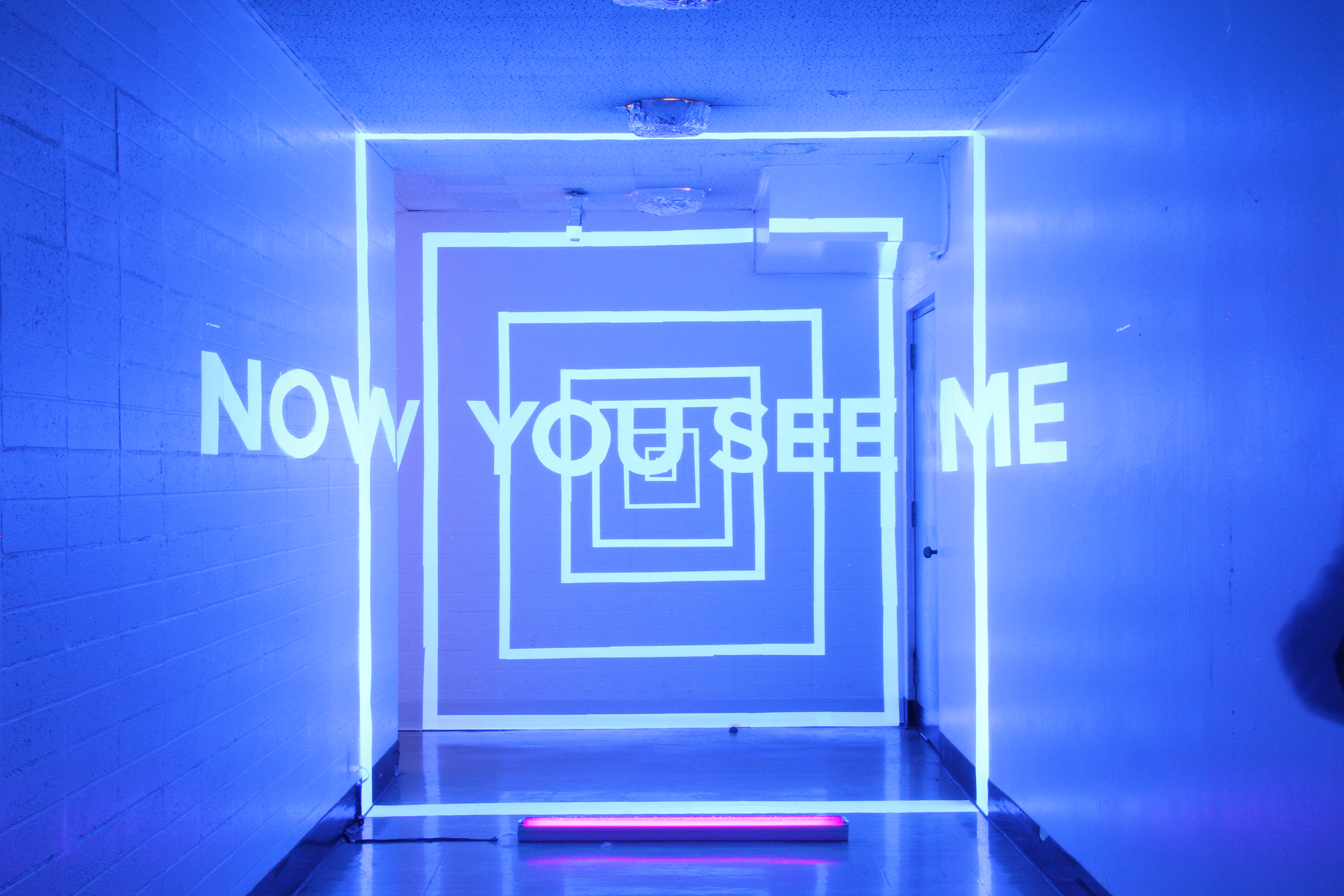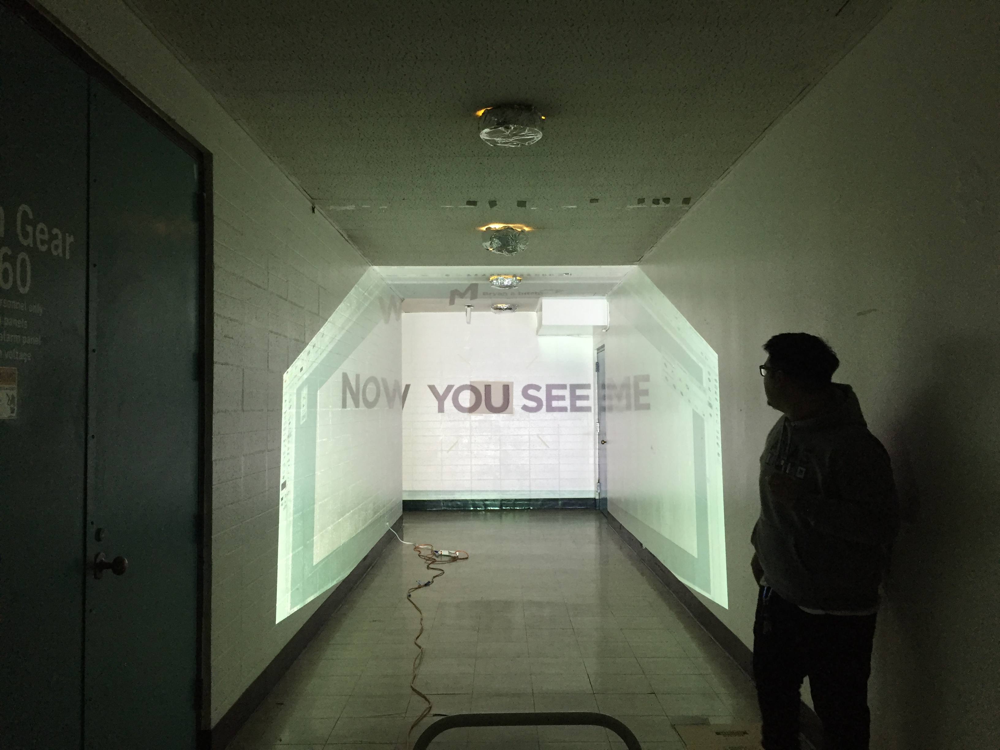 Using a projector, we altered the letters of “Now You See Me” to look like a straight line when viewing from a specific spot marked on the ground. Then, we traced those shapes on white paper and taped it in place.